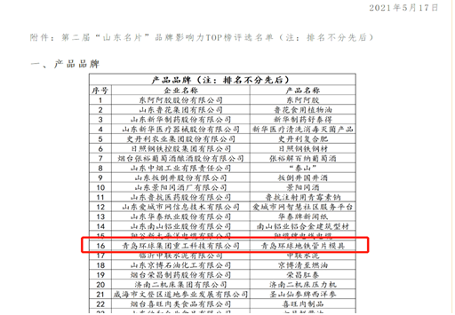 近日,“品牌強(qiáng)省 創(chuàng)領(lǐng)未來——第二屆‘山東名片’品牌影響力TOP榜”評(píng)選結(jié)果揭曉,青島環(huán)球重工科技有限公司榜上有名,地鐵管片模具榮登“產(chǎn)品品牌”TOP榜。