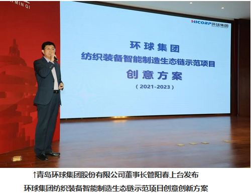 作為東道主的青島環球集團董事長管陽春上臺發布了“紡織裝備智能制造生態鏈示范項目創意方案”。管陽春董事長從規模、市場、研發、品牌、行業引領、行業示范七個方面介紹了環球集團的主要優勢,深度剖析了紡織行業目前的痛點,重點提出了“環球智工廠”解決方案。并對環球的發展規劃、發展訴求以及“環球智工廠”的品牌建設進行匯報,希望能在政府及各位專家的支持下、在擁有“爭先鋒”基因的環球人的努力下,實現環球人的初心和使命——“讓環球員工、股東生活得更有尊嚴,讓中國制造贏得世界尊重”。
